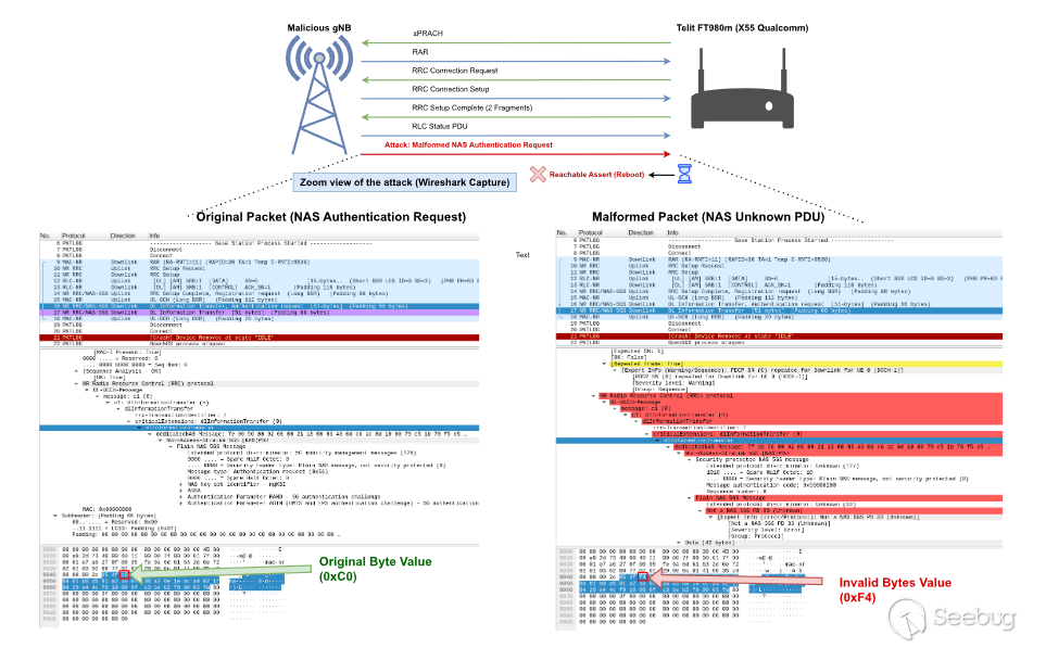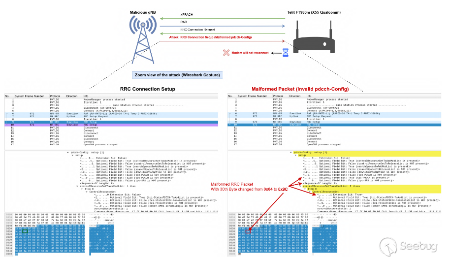 在这个漏洞中,处于高通 X55/X60 用户设备(如智能手机和 CPE 路由器)无线电范围内的攻击者可以通过从一个邻近的恶意 gNB 发送格式错误的 RRC 帧,触发 5G 连接降级或拒绝服务攻击。在 RRC 附着过程中,攻击者(恶意 gNB)发送格式错误的 NAS PDU,将 RRC dlInformationTransfer 有效负载的第 30 个字节从 0x04 更改为 0x9C。这一修改影响 pdcch-Config 的可选位,例如 tpc-PUCCH 和 Sequence-Of Length。这种格式错误的消息发送到 5G 用户设备后,设备将无法连接任何 5G 网络。