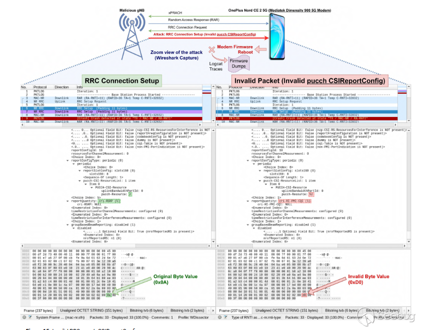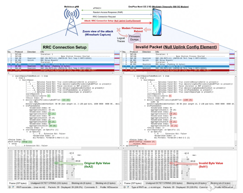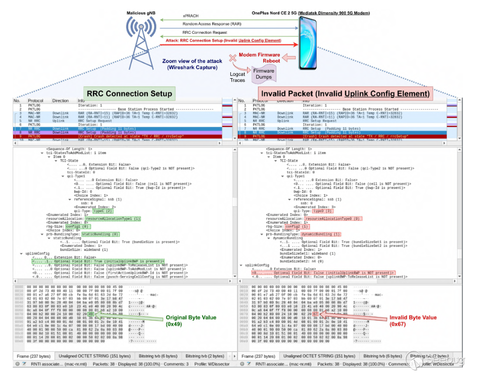 在这个场景中,攻击者位于无线电范围内,能够通过从一个恶意 gNB 向目标 5G 用户设备(如智能手机)发送无效的下行 RRC 帧,从而在 Mediatek Dimensity 900 / 1200 5G 调制解调器固件中引发拒绝服务攻击(空指针取消引用)。在 RRC 连接过程中,攻击者(恶意 gNB)发送格式错误的 RRC 连接设置,将下行链路传输块的第 14 和 15 字节从 0xBA 0xE0 更改为0x13 0x46。这对应于将 physicalCellGroupConfig 内的一些字段更改,例如将扩展位更改为 0x01 并将 pdsch-HARQ-ACK-Codebook 更改为 0x00。因此,这会导致 RRC 消息被截断,从而导致编码错误,如 Wireshark 中突出显示的那样。此类畸形数据包发送至 5G 用户设备后,Dimensity 900 5G 调制解调器出现故障并重启,Android 日志(logcat)中显示固件内存访问错误。更具体地说,调制解调器暂时挂起并在 2 到 7 秒内执行重新启动,这种情况可以通过 Android 的日志记录工具 logcat 记录到的固件断言消息来确认。