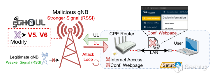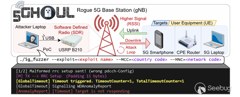 选择 “5Ghoul” 作为这个漏洞的名称反映了其特征和潜在影响。名称 “5Ghoul” 结合了两个元素:“5G”,指代漏洞影响的技术领域,即第五代移动通信技术;以及 “Ghoul”,一词源自阿拉伯神话中的一种生物,类似于恶魔,以诱导并捕食旅行者而闻名。这个比喻用于描绘 5Ghoul 漏洞的行为:就像恶魔诱导旅行者一样,这个漏洞诱使用户设备(UE),如智能手机和其他支持 5G 的设备,连接到恶意基站(gNB)。