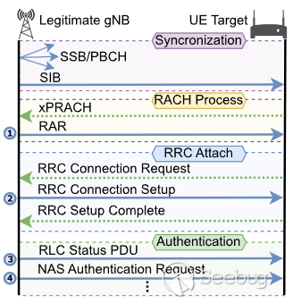 本文还将对 5G UE 设备与合法 gNB 之间的连接过程进行详细展示。此过程涉及多个协议层,包括无线资源控制(RRC)、非接入层(NAS)、介质访问控制(MAC)、分组数据汇聚协议(PDCP)和无线链路控制(RLC)。这些协议确保了连接的成功建立和安全性。