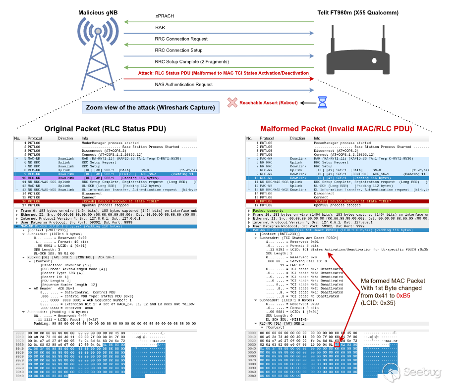 在这个漏洞中,攻击者可以在无线电范围内从一个恶意的 gNB(基站)向目标 5G 用户设备(UE),如智能手机,发送无效的下行链路 MAC 帧,从而触发高通 X55/X60 调制解调器固件中的拒绝服务攻击。这种攻击发生在 RRC 附着过程完成后,此时攻击者发送格式错误的 RLC 状态 PDU,并将下行链路传输块的 MAC 标头(第一个字节)从 0x41(代表DL-SCH)更改为 0xB5(代表 MAC TCI 状态激活/停用)。