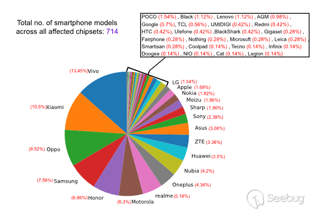 为了查找可能受影响的智能手机型号,我们在 Kimovil 网站上进行了搜索,该网站可以轻松过滤出所有搭载给定处理器芯片组的已发布智能手机型号。受影响芯片组的型号可以在供应商 2023 年 12 月安全公告中找到。尽管如此,高通公司的安全公告列出了除智能手机中使用的其他受影响的(物联网)芯片组平台。因此,我们仅从本公告中提取芯片组平台(例如,Snapdragon 8XX)。遗憾的是,我们无法将联发科安全公告中发布的芯片组名称与天玑芯片平台对应。因此,我们仅搜索采用我们评估中使用的确切芯片组名称(天玑 900/1200)的基于联发科的手机,以避免误报。从而计算出的受联发科技调制解调器漏洞影响的智能手机型号集被低估了。