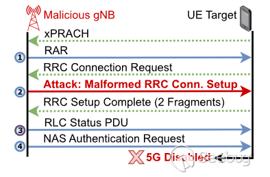 在高通 X55/X60 用户设备无线电范围内的攻击者可以通过发送单个畸形数据包来拒绝或降级 5G 连接。用户需要手动重启手机来恢复 5G 连接。此外,由于攻击的发起不需要获取目标 SIM 卡的信息,因此这种漏洞相对容易被触发。无效的下行链路帧是在 RRC 附着程序期间发送的,而该程序发生在任何 NAS 认证程序完成之前。