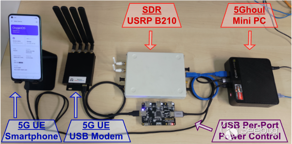 实际上,5Ghoul 漏洞可以轻松通过在目标用户设备的无线范围内启动恶意 gNB 来进行利用。攻击主要依赖于使用软件定义无线电(SDR)设备,如 USRP B210,来模拟一个恶意的 gNB。尽管在我们的设置中使用的 SDR 设备可能在视觉上可被识别,但现在这类设备已经微型化到与树莓派相似的大小,从而使得攻击在外观上更隐蔽。