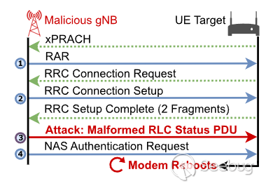 攻击者可以通过连续发送此类无效数据包来阻止 3GPP 调制解调器连接。此外,由于启动攻击无需获取目标 SIM 卡的信息,因此相对容易触发此漏洞。这是因为无效下行链路帧的发送发生在 RRC 附着流程期间,而此流程在 NAS 认证流程开始之前进行。