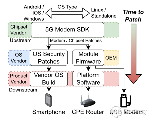 对于 CPE 路由器或 USB 调制解调器来说,软件依赖链类似,但由于不受操作系统供应商发布时间表的约束,补丁到达终端用户的时间较短。模块供应商(即 OEM)直接将调制解调器补丁构建到模块固件中,并通过私人渠道向下游分发。这使得 CPE 产品供应商能够直接将上游的补丁应用到其平台软件上,这些平台软件通常包括定制的 Linux 操作系统。