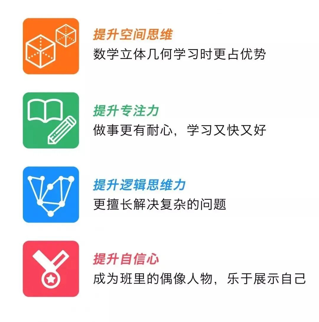 魔方发明之初,就是为了提升人的空间思维力。想把每个小方块移动到正确位置,就需要不断调动空间思维能力。在不断强化训练中,孩子空间感会越来越强,学习立体几何更容易。