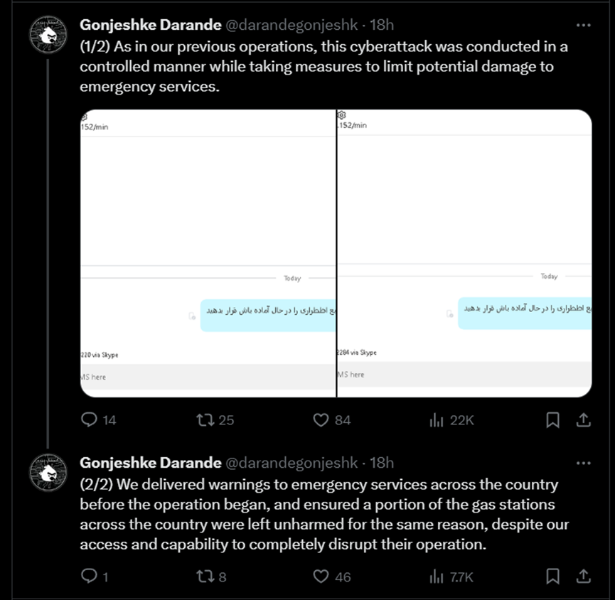 该组织在 Telegram 上的一份声明中表示[2]“这次网络攻击是以受控方式进行的,以避免对紧急服务造成潜在损害”,并宣称这次网络打击是 "对伊斯兰共和国及其在该地区代理人侵略行为的回应"。