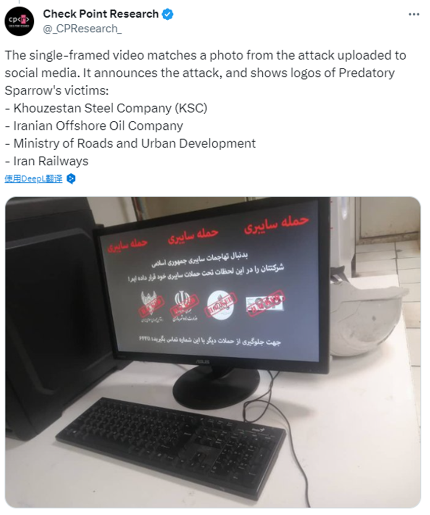 在2022年,CheckPoint的研究人员又发现该组织的相关攻击活动,针对伊朗钢铁制造商实施网络攻击。6月28日[9]发现了与伊朗钢铁行业相关的文件,初步分析表明,该恶意软件与去年针对伊朗铁路的攻击有关。攻击者宣布了这次袭击,并显示了 "Predatory Sparrow"受害者的标志。受影响的公司主要是:胡齐斯坦钢铁公司 (KSC)、伊朗海洋石油公司、道路和城市发展部、伊朗铁路公司。