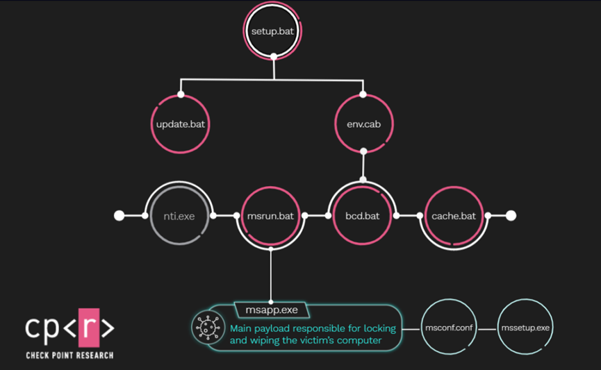 几天后,伊朗网络安全公司 Amnpardaz Software [7]发布了对据称与这些攻击相关恶意软件的简短技术分析,该恶意软件被称为Trojan.Win32.BreakWin。在此期间,SentinelOne 根据 Amnpardaz 的分析也发布了相关报告[8]。CheckPoint的研究人员根据所得到的资料进行分析,以下是流程图: