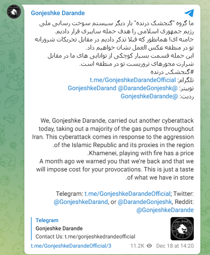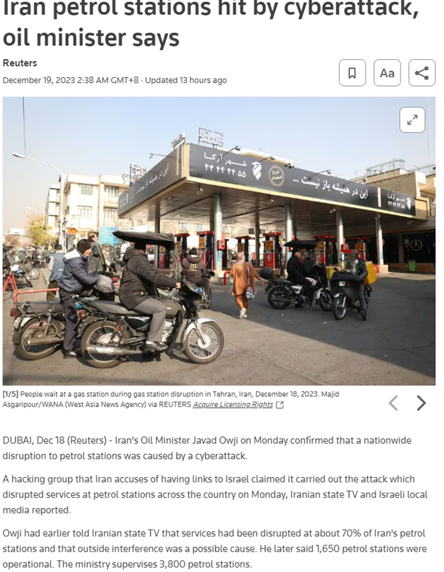 12 月 18 日路透社发文表示[1],与以色列有联系的黑客组织Predatory Sparrow(又称Gonjeshke Darande、Indra)称周一针对伊朗加油站发动袭击,导致伊朗约 70% 的加油站服务中断。