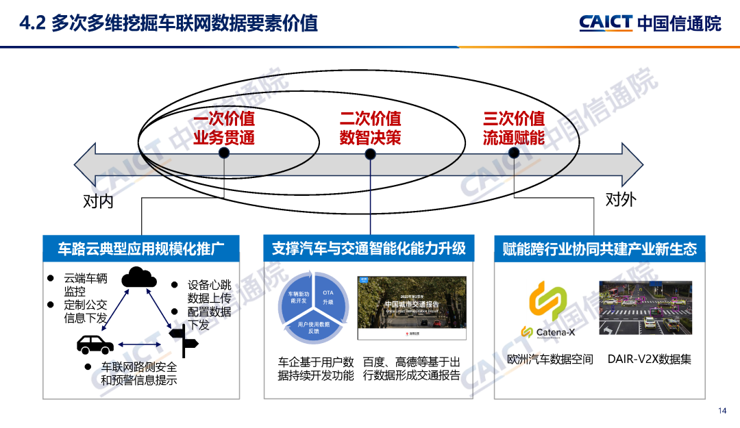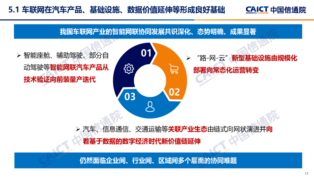 白皮书聚焦2023年涌现的新热点、新趋势、新业态,在提炼全球车联网产业总体发展态势的基础上,重点关注我国智能网联汽车载体、新型基础设施构建体系、数据要素价值三大方面的发展,分析智能网联汽车产品与业态创新变革进程、总结基础设施建设部署进展以及技术迭代演进趋势、阐述数据要素安全释放价值以及保障举措,并从“企业融合、行业协同、区域共用”3个层面提出持续深化智能网联协同发展战略的举措建议。
