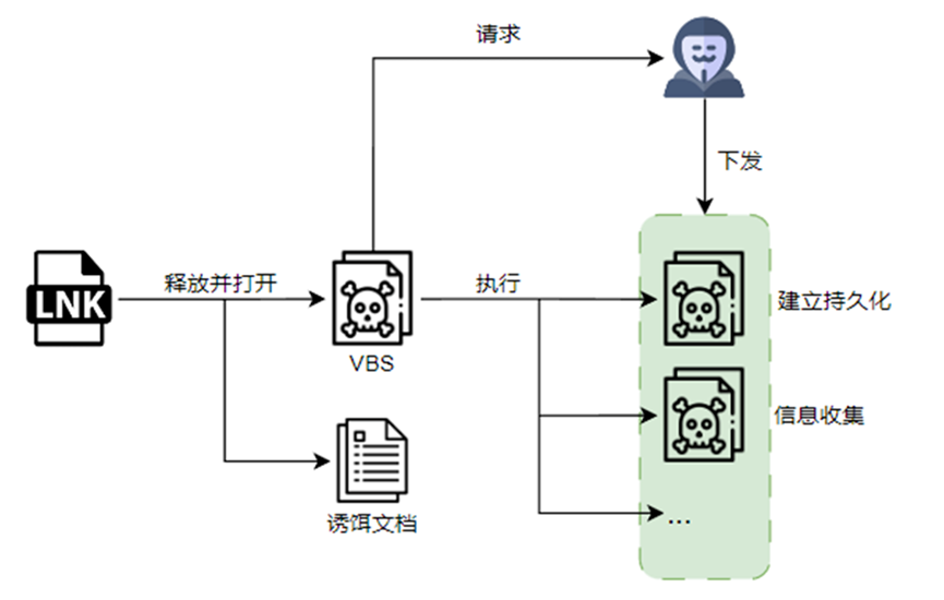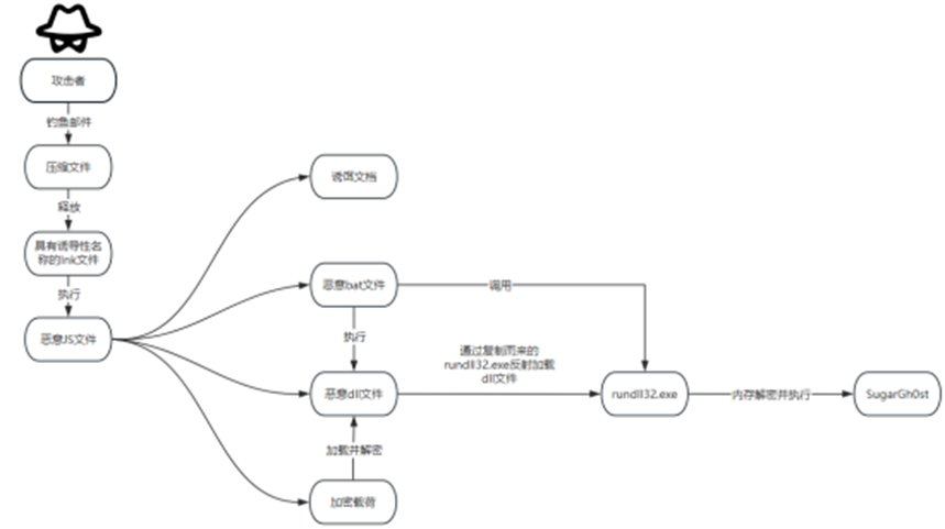 在该起事件中,攻击者分别设计了三款以PDF与Word文档进行伪装的lnk文件,并使用特殊文件名以诱导用户点击,进而完成后续的感染链攻击。经分析,感染链的最终阶段都将释放一款由Gh0st改编而来的远控木马SugarGh0st,可以推断威胁行为者的最终目标是获取指定目标主机的访问及控制权限,进行敏感信息窃取活动以及其他危险行为。