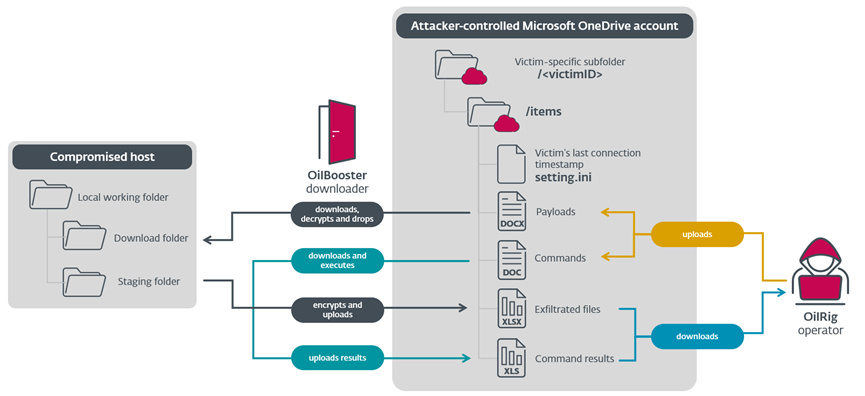 研究人员分析了一系列OilRig的下载器,该组织在整个 2022 年的几次活动中都使用了这些下载器,以保持对目标(全部位于以色列)的访问。研究人员将这些轻量级下载程序命名为 SampleCheck5000 (SC5k v1-v3)、OilCheck、ODAgent 和 OilBooster,它们的显著特点是使用合法云服务 API进行 C&C 通信和数据外渗:Microsoft Graph OneDrive 或 Outlook API,以及 Microsoft Office Exchange Web Services (EWS) API。