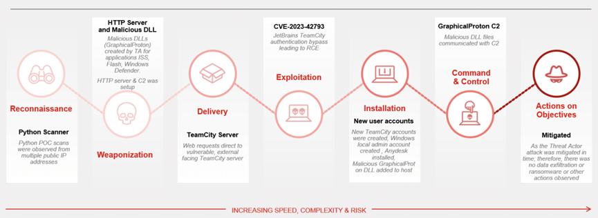 2023 年 9 月 6 日,Sonar 的研究人员发现了一个关键的 TeamCity On-Premises 漏洞(CVE-2023-42793)。2023 年 9 月 27 日,Rapid7 发布了针对该漏洞的公开漏洞利用程序。该关键漏洞的 CVE 得分为 9.8,这很可能是因为攻击者可以部署公开可用的漏洞利用程序,无需身份验证,只需向托管受攻击应用程序的任何可访问 Web 服务器发出基本 Web 请求,即可在受害服务器上支持远程代码执行。该漏洞已被观察到在野外被积极利用,并于 2023 年 10 月 4 日被添加到 CISA 的 "已知漏洞利用目录 "中。
