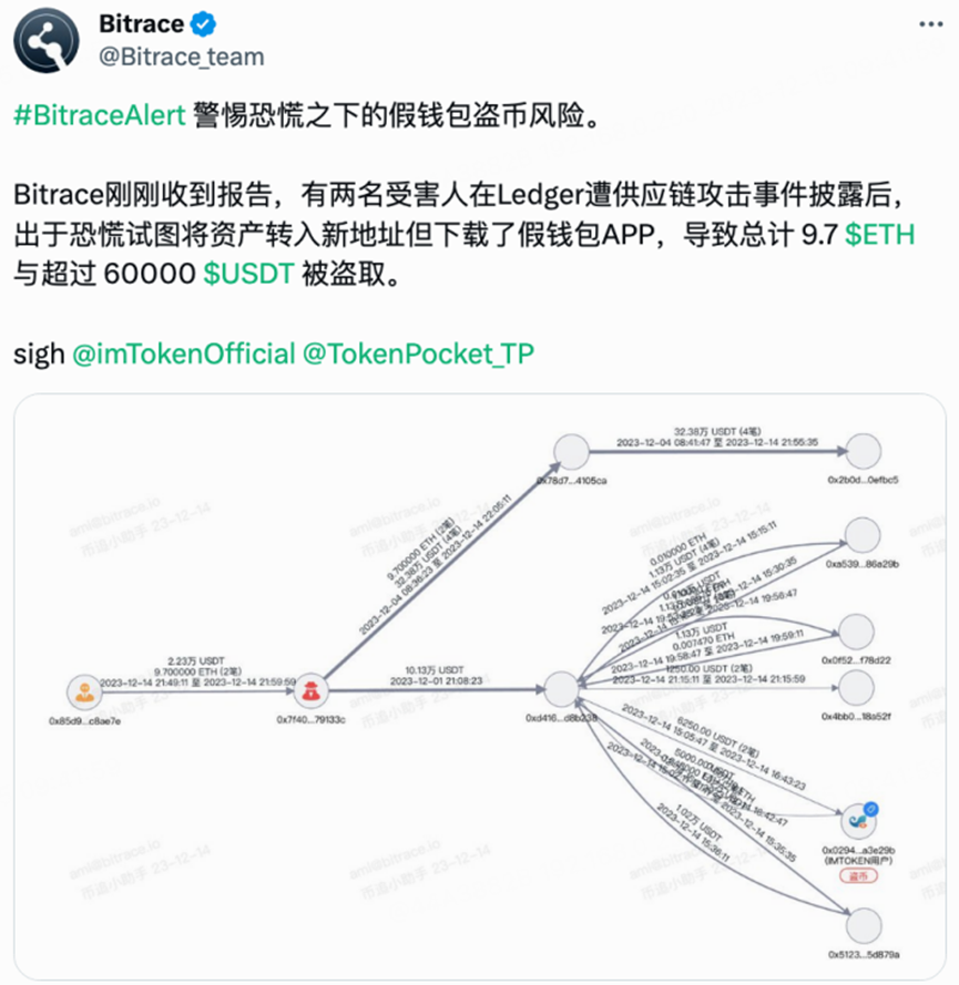 通过 CDN 分发对加密货币用户发起钓鱼攻击。攻击者这一波攻击,就可以执行与应用程序具有相同权限级别的任意代码。例如,攻击者无需交互即可立即耗尽用户的所有资金;发布大量钓鱼链接诱导用户上当;甚至利用用户的恐慌情绪,用户试图将资产转入新地址,下载了假钱包导致资产损失。