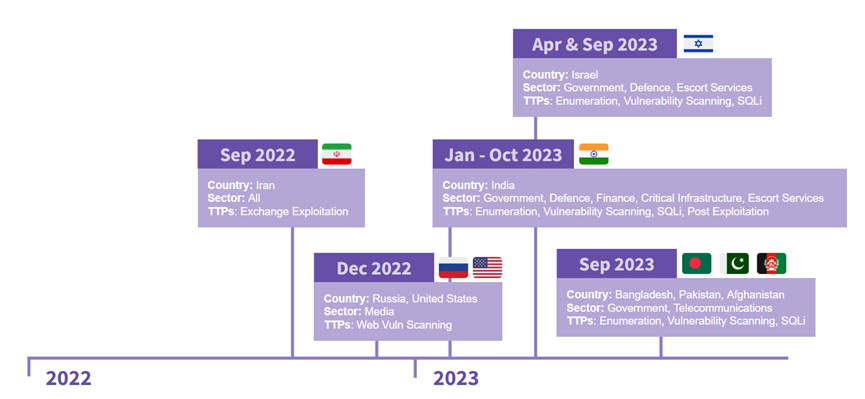 近期,研究人员公开了一起持久性攻击活动。攻击者至少从2022年9月开始,向伊朗、俄罗斯、美国、印度等国家发起攻击,受影响行业包括政府、金融、电信、教育、国防、网络安全公司等。攻击者在初始攻击前首先会进行信息收集,获取目标的资产信息以及验证各资产是否存在历史漏洞。安全人员观察到攻击者曾使用sqlmap工具与ghauri工具进行SQL注入攻击。曾使用的历史漏洞包括CVE-2021-26855、CVE-2021-27065、CVE-2019-11043、CVE-2021-21972、CVE-2020-14882等。