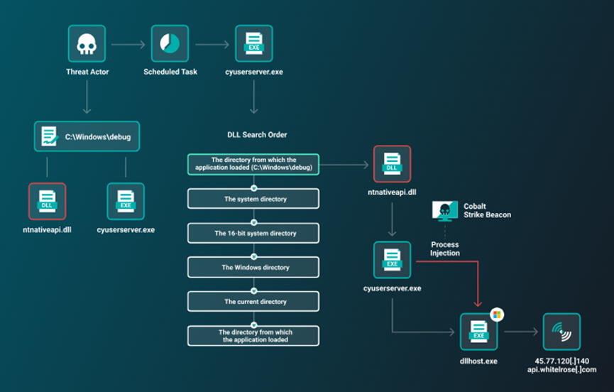 威胁行为者通过相对复杂的 TTPs 来躲避检测,包括滥用数字签名和易受攻击的 Palo Alto Cortex XDR 二进制文件通过 DLL sideloading 执行、通过解除端点检测和响应 (EDR) 来阻碍防御措施的 BYOVD 攻击、使用 Impacket 以及使用重命名的 Rclone 二进制文件外渗。在 BYOVD 攻击中,行为者滥用提供给合法但易受攻击的驱动程序的权限,以获得内核级访问权限并禁用或修改已安装的安全工具。