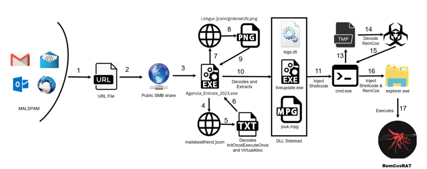 感染的目的是引导RemCosRAT 的执行,这是一款用于远程控制的轻量级合法软件,网络犯罪分子利用它来促进对受感染机器的访问,并在新的网络犯罪商业模式中实现其初始访问代理的新目标。