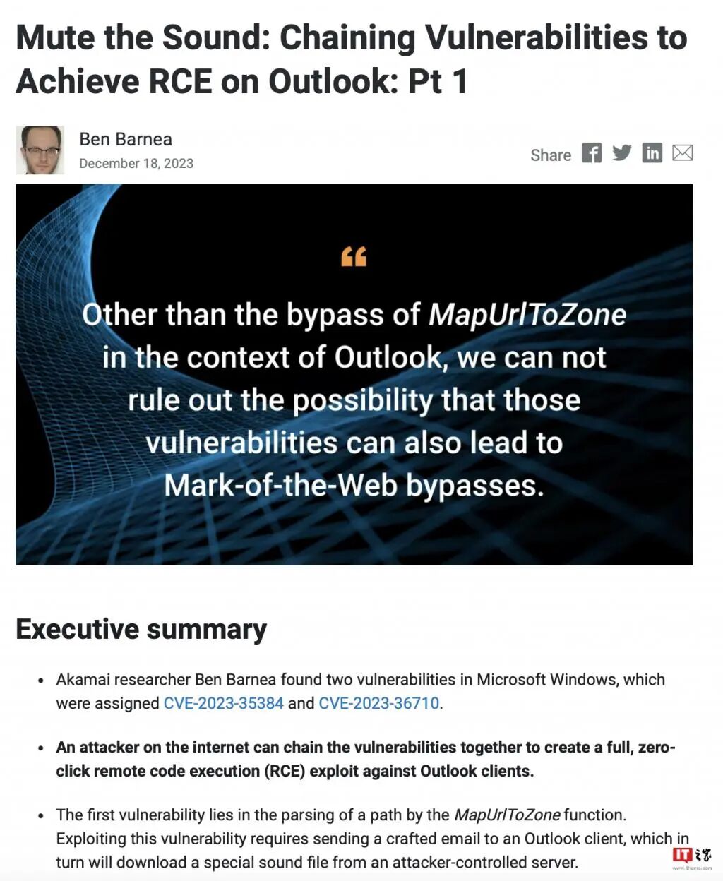 微软承认 Win10/11 存在邮件漏洞,黑客可用音频文件远程执行代码