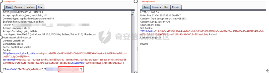 在抓取短信验证码的数据包后,在 response 可以看到短信验证码