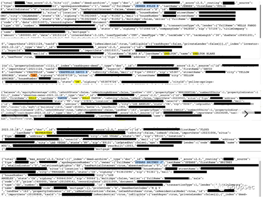 经过研究人员检查,在数据库中发现大量文娱明星、政商大佬的房产数据,包括凯莉·詹纳、布莱克·谢尔顿、布兰妮·斯皮尔斯、弗洛伊德·梅威瑟(世界拳王)、戴夫·查佩尔、埃隆·马斯克(特斯拉创始人)、多莉·帕顿、唐纳德·特朗普、马克·沃尔伯格和南希·佩洛西的房产数据都被泄漏。研究者能够看到他们的街道地址、购买价格和日期、抵押贷款公司、抵押贷款金额、税号、所欠税款、已付税款或到期税款以及其他信息。