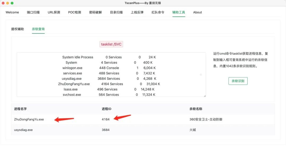根据windows的tasklist信息,匹配杀软进程,内置1042条杀软识别规则。返回进程名称、进程ID、杀软名称等信息。