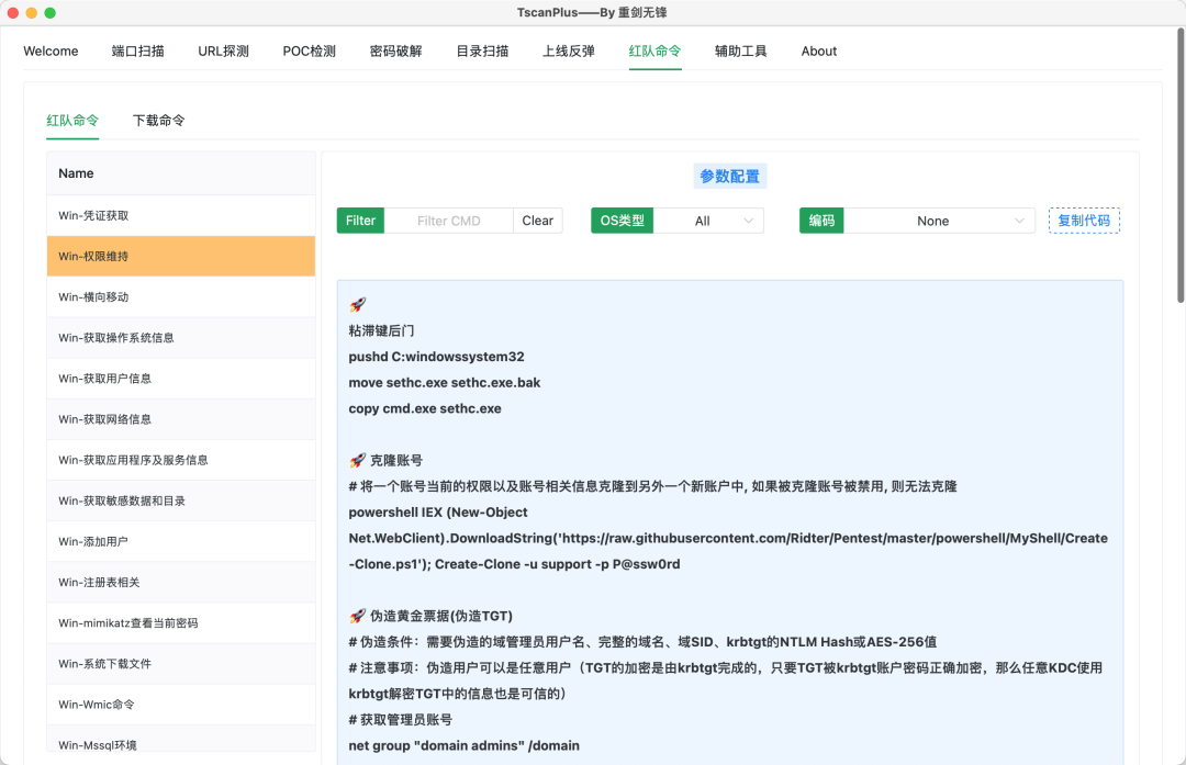 TscanPlus内置常用红队命令,包括Win内网(凭证获取、权限维持、横向移动)命令26类、Linux内网命令18类、下载命令31条。