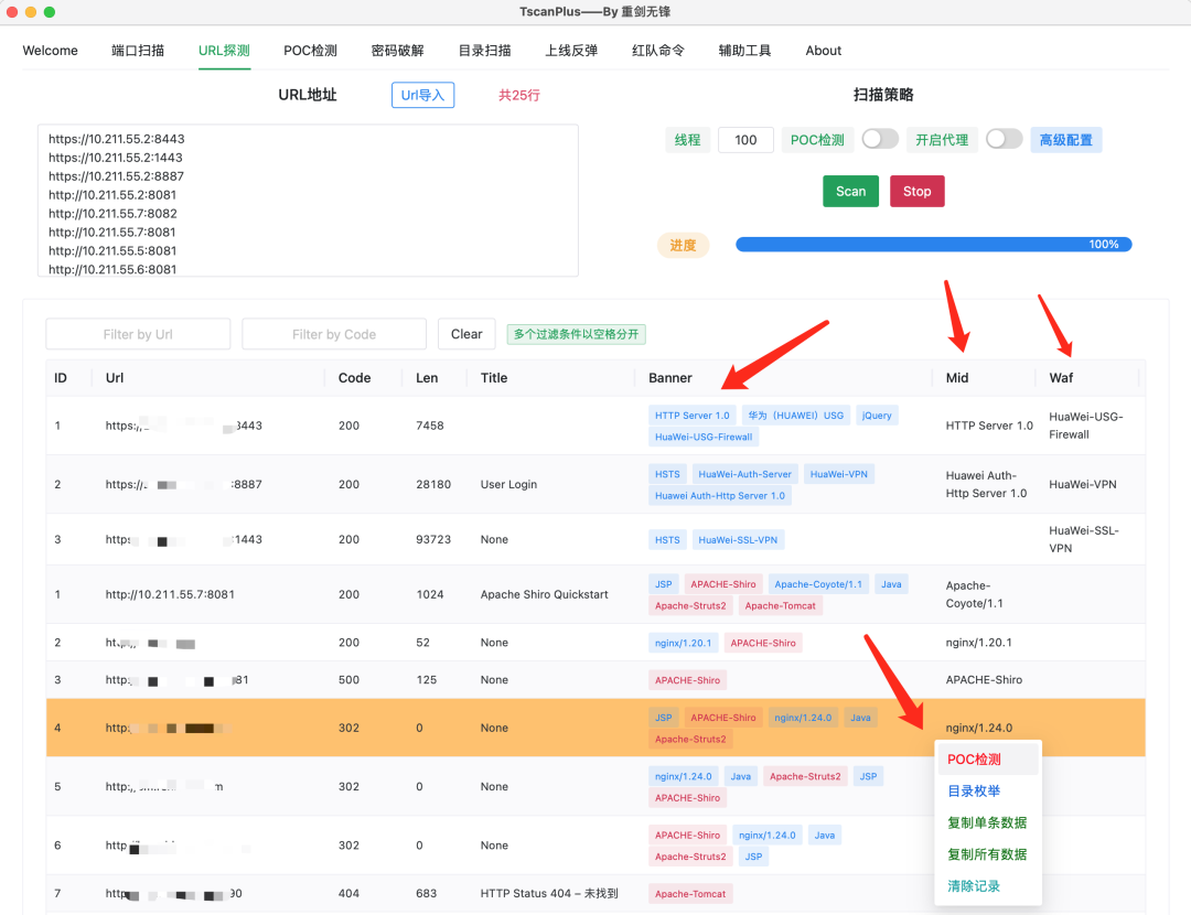 扫描结果如下,会显示web站点标题、Banner、状态码、中间件、WAF识别等,如Banner中匹配到可能存在漏洞的产品会使用红色标识。
