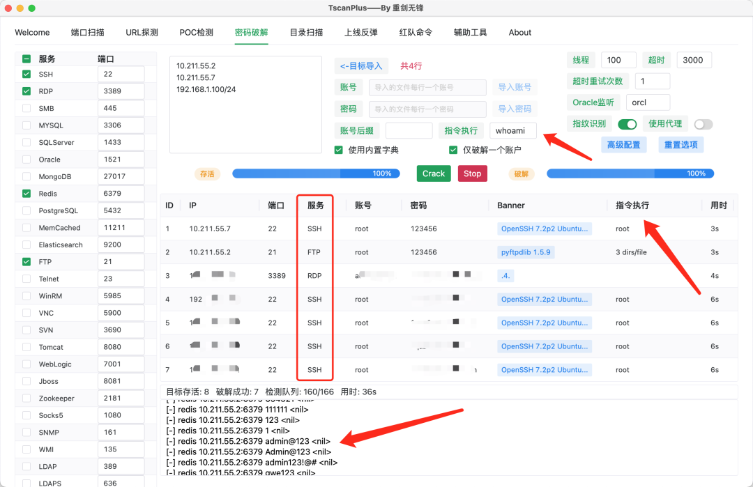 扫描结果如下,会显示发现弱口令的服务、账号、密码、Banner、执行命令、用时等。