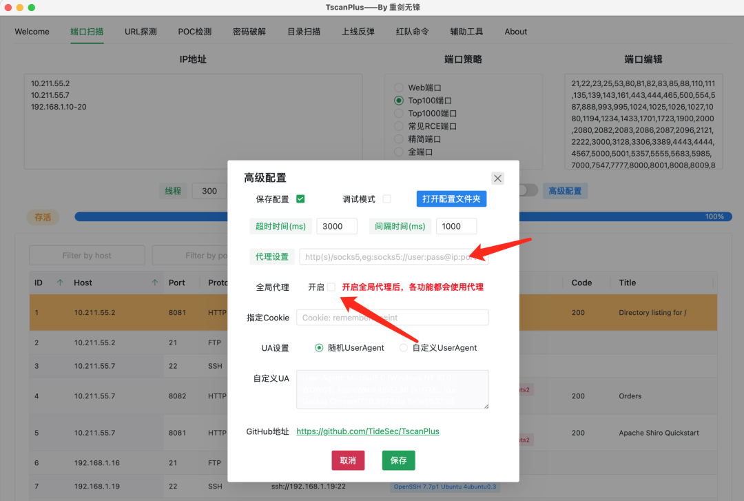 同样,可选择线程数、是否同步POC检测、是否开启代理,配置任务后可开启扫描。