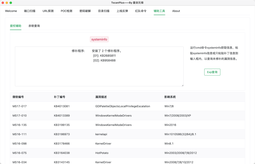 根据systeminfo信息查询未修补的漏洞信息,返回漏洞微软编号、补丁编号、漏洞描述、影响系统等信息。