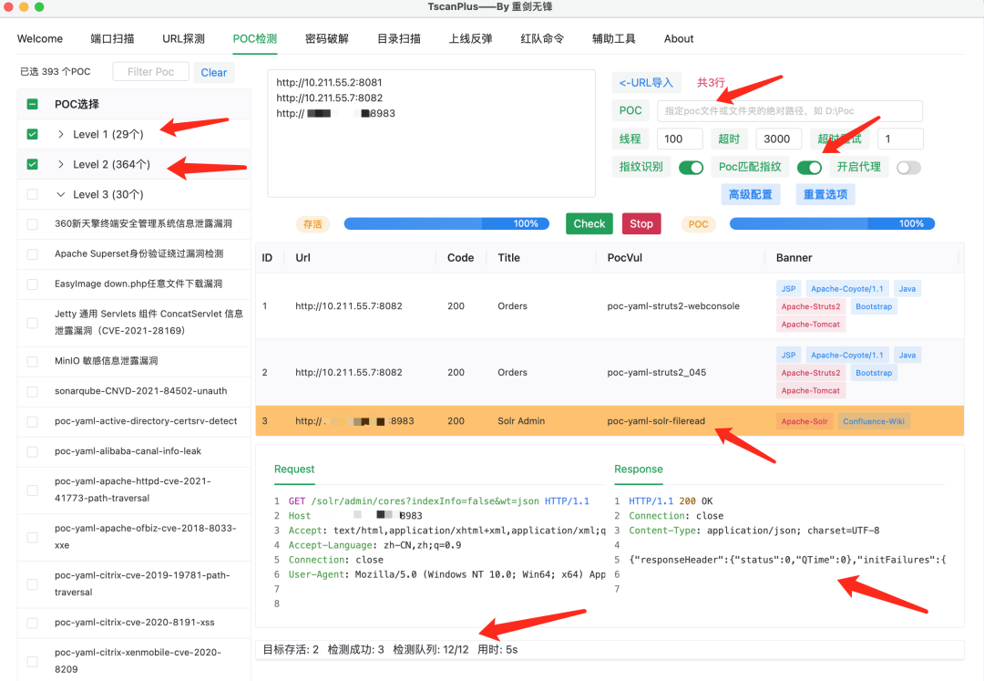最下方会显示目标存活数量、检测成功POC数量、检测队列情况、用时等。
