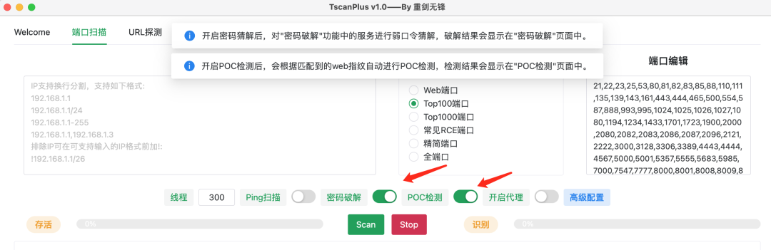 在任意功能中,都可与其他功能进行联动,比如IP扫描时可同时开启密码破解和POC检测,一旦发现匹配的端口服务会自动进行密码破解,发现匹配的指纹时会进行poc检测。勾选这两项即可,结果会显示在相关模块中。
