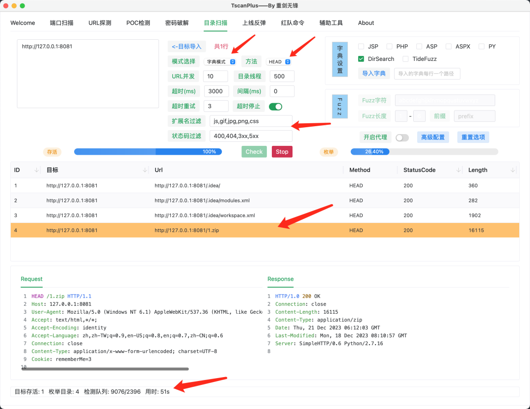 目录扫描主要是对web站点进行目录枚举,支持字典模式、Fuzz模式、存活探测等,支持HEAD/GET方法,默认使用HEAD方法。