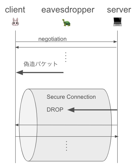 攻撃者はSecure Connectionの確立前(=鍵共有の完了前)にIGNOREパケット*3を偽造する。図ではクライアントに対して送り付けているけど逆でもよくて、どのパケットをDROPしたいかによる。