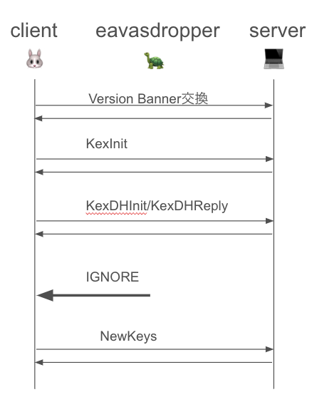 ……という話をしたら、じゃあKEX_INITを改竄すればいいじゃんという指摘をもらって、たしかにと思ったけど、KEX_INITの値はこのあとのKEX_DHREPLYで計算されるハッシュに利用されるので改竄されると気が付かれるようだった。逆にIGNOREはそういうハッシュに含まれないので気がつけない。このあたりTLSはTranscript Hashなるやつを採用していて対策できていると論文にあった気がするので、次はそのあたりが気になる*4