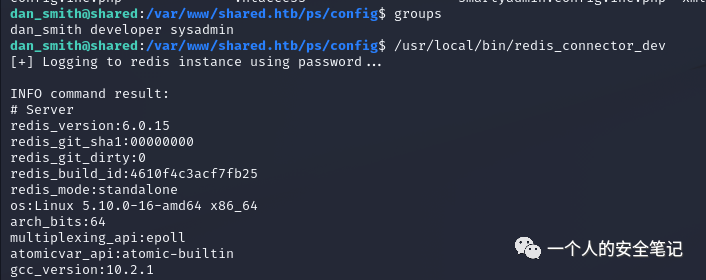 发现 dan_smith 用户有一个 sysadmin 组,继续使用 find 查询全局文件,发现有一个 redis_connector_dev 二进制程序。