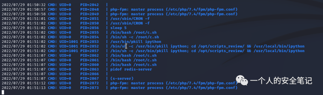 在没有获得更多信息的前提下,将 pspy 工具传递至目标服务器运行监听计划任务,发现 dan_smith 用户会定时 ipython。