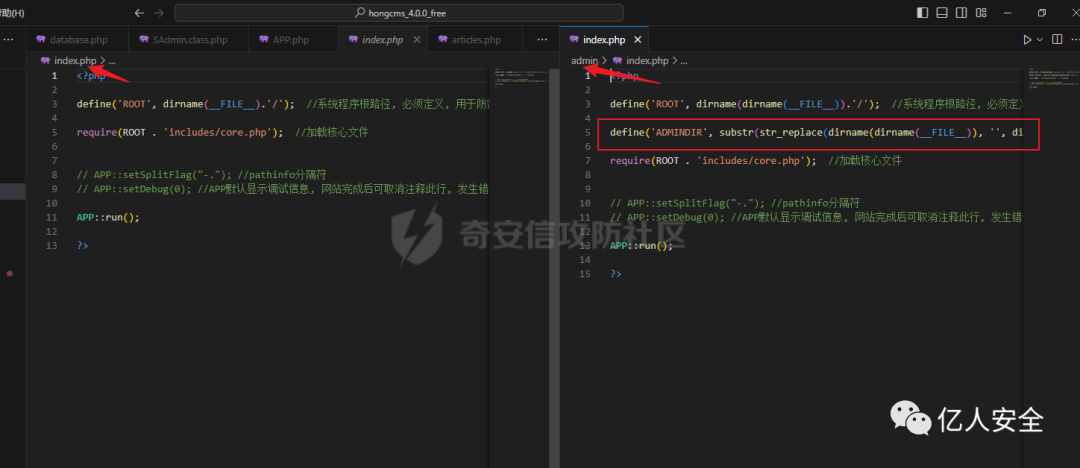 查看两个文件,发现它们没有什么不同之处,定义了ROOT,然后进入APP:run()。除了admin文件夹下的index文件中定义了一个常量ADMINDIR。