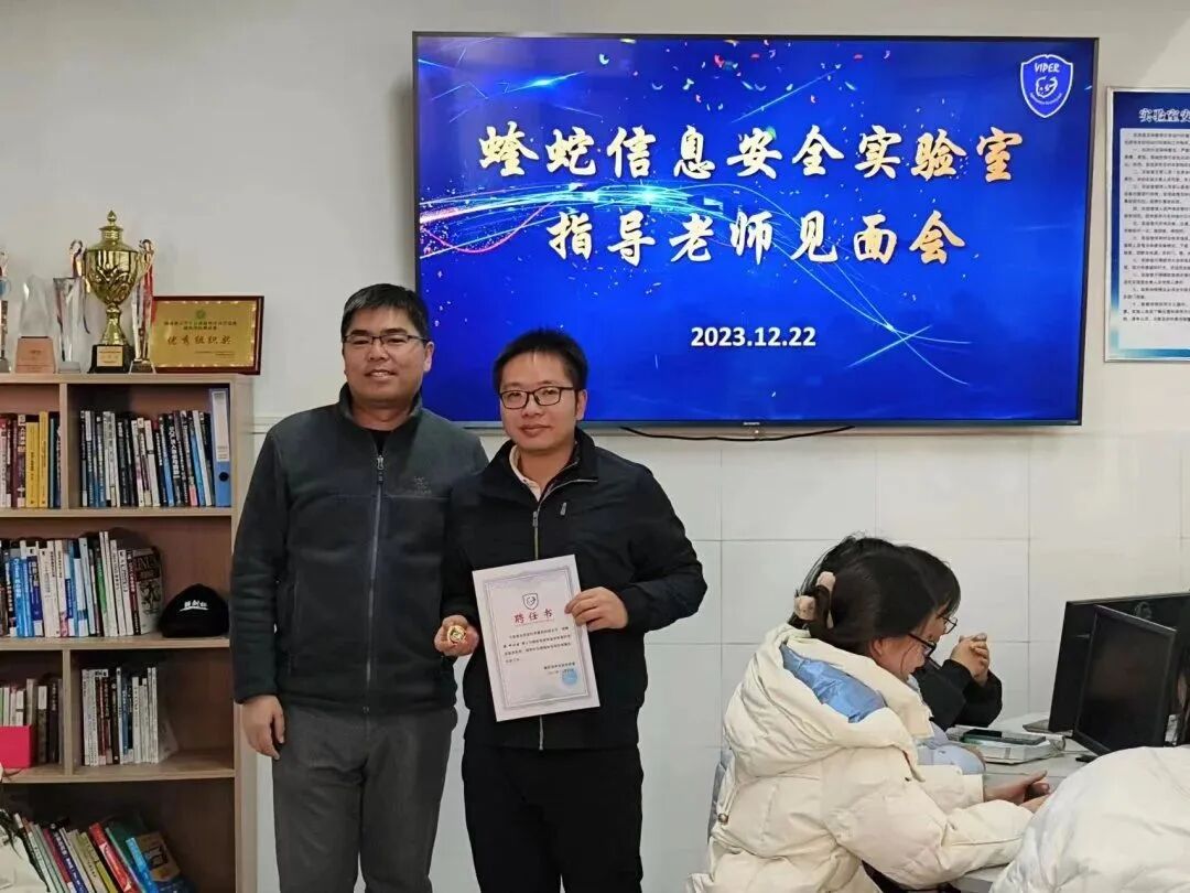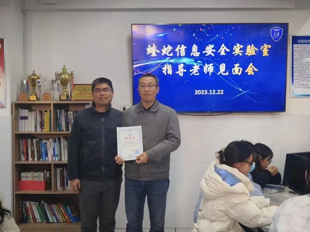 2023年12月22日,蝰蛇实验室举办了指导老师见面会,刘鑫波,李頔,邓阳君,李伟四位优秀的老师受邀正式加入蝰蛇实验室,成为实验室的指导老师。标志着蝰蛇实验室在学术导师团队建设上迈出了重要的一步,为学生们提供了更广阔的学术交流平台和学术资源支持。