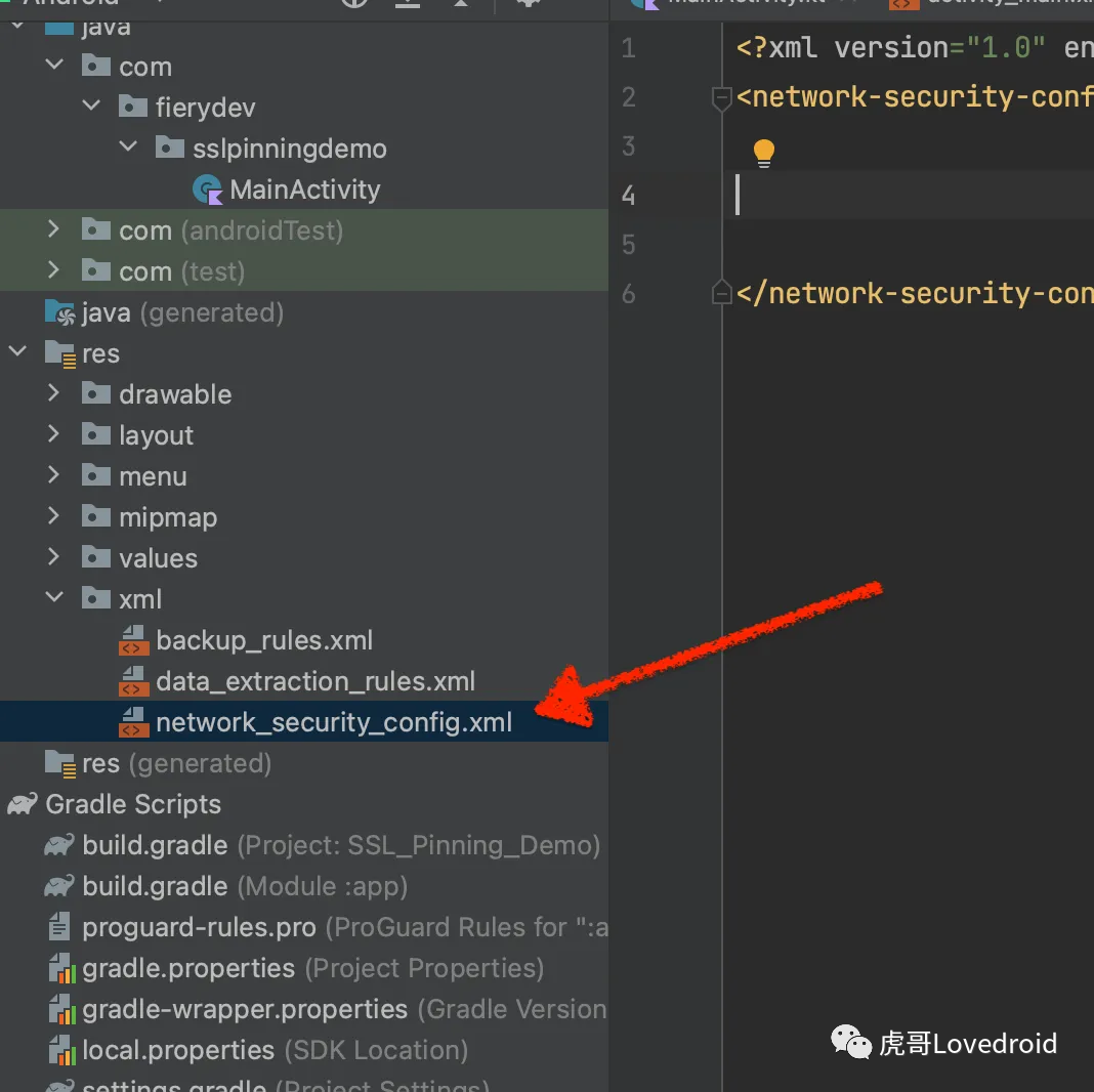 让我们首先在 network_security_config.xml 中定义我们受信任的域及其相应的公钥固定值: