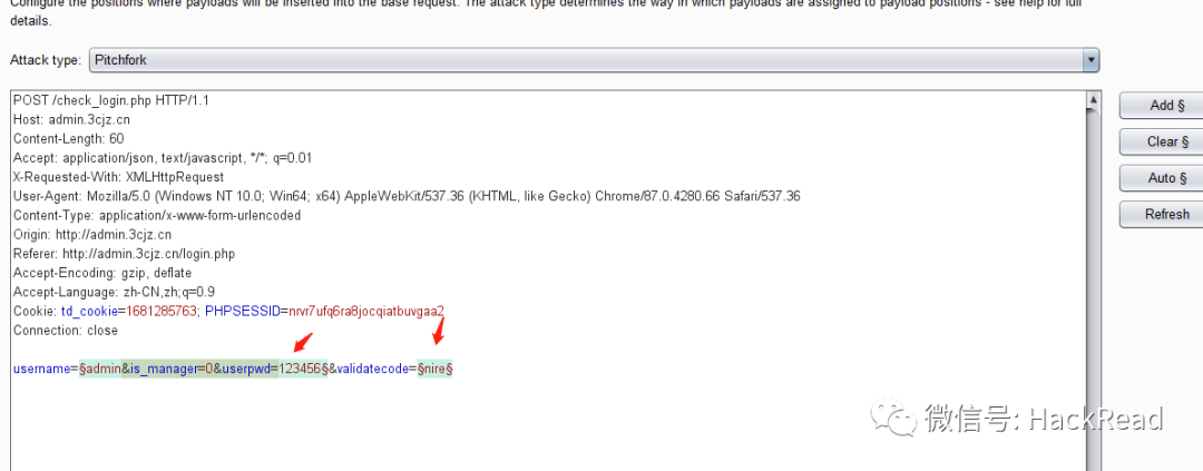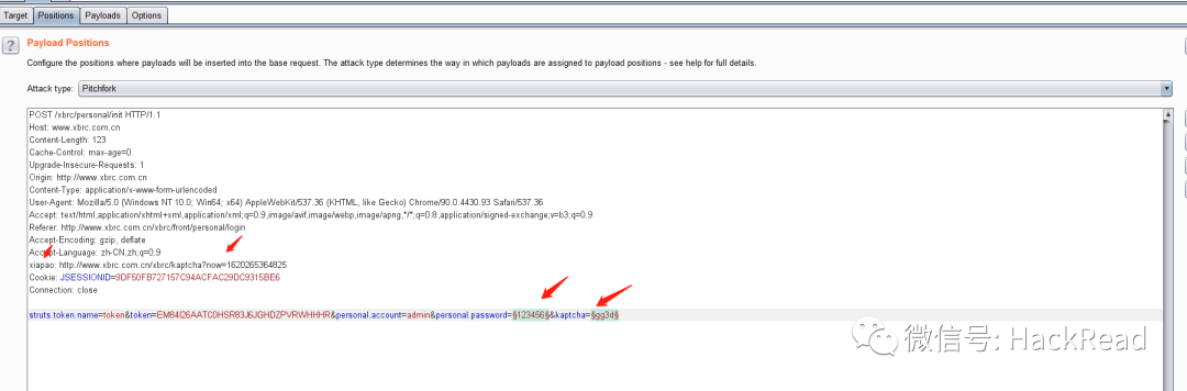 Attack type处选择 Pitchfork,在http头部位置插入xiapao:验证码的URL地址