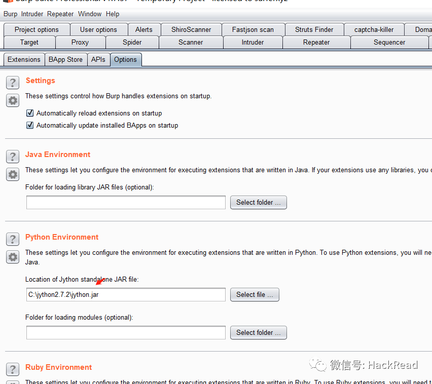 先下载jypthon插件,并加重环境变量,修改完后导入burp