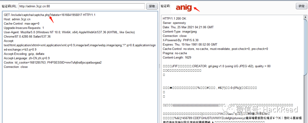 3.然后点击验证码获取验证码的地址,通过buspuit拦截验证码获取地址,然后proxy--proxy history中发送数据包到repeater中,选中它并点击右键选择“send to captcha panel”,这个请求的信息将被发送到captcha-kiler