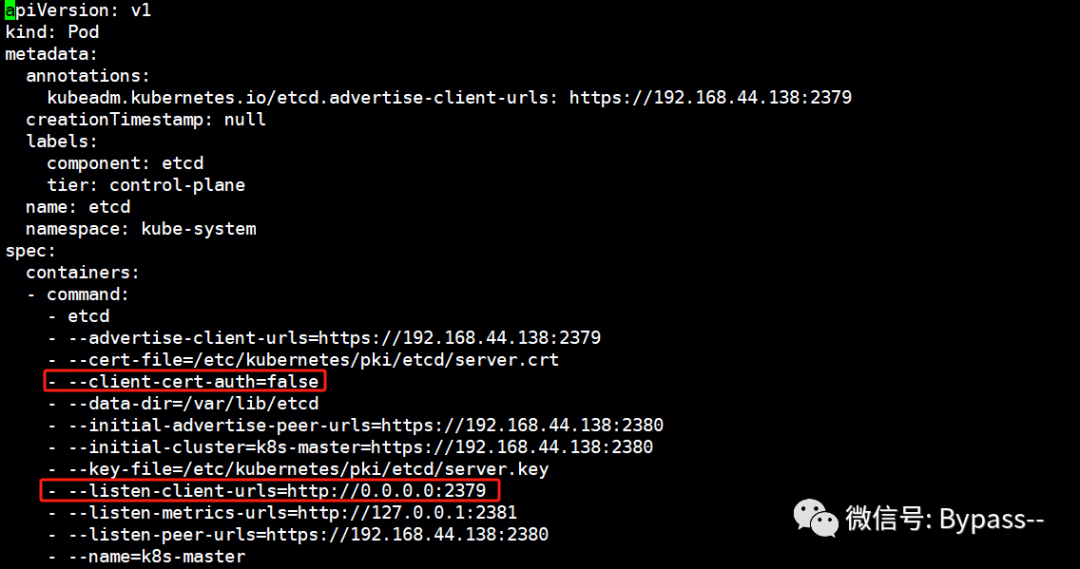 将client-cert-auth=true 改为false,把listen-client-urls监听修改为0.0.0.0,将端口被暴露出去,导致etcd存在未授权访问漏洞。