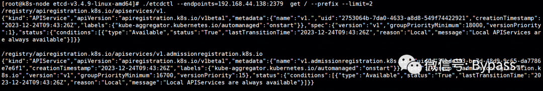 s://github.com/etcd-io/etcd/releases/download/v3.4.9/etcd-v3.4.9-linux-amd64.tar.gztar -xf etcd-v3.4.9-linux-amd64.tar.gzcd etcd-v3.4.9-linux-amd64#读取etcd中存储的数据,通过--limit选项限制数量export ETCDCTL_API=3./etcdctl --endpoints=192.168.44.138:2379 get / --prefix --limit=2