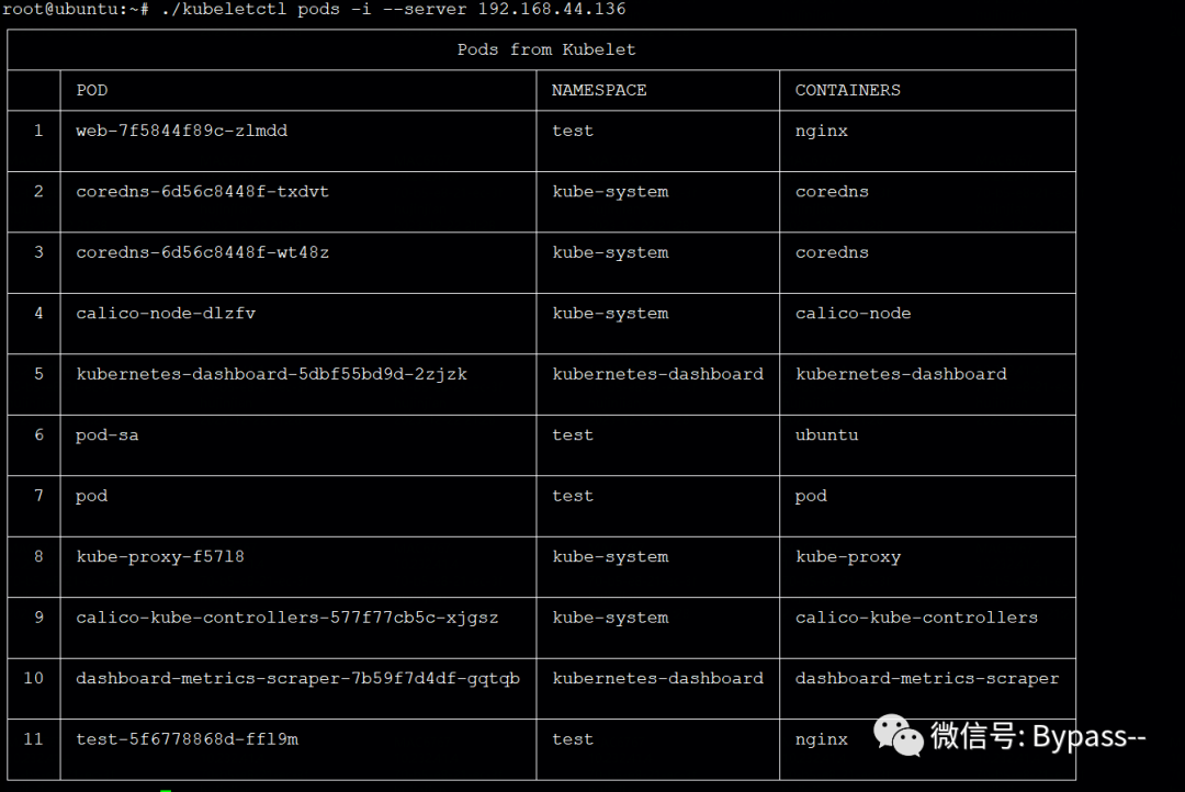 wget https://github.com/cyberark/kubeletctl/releases/download/v1.11/kubeletctl_linux_amd64chmod 777 kubeletctl_linux_amd64mv ./kubeletctl_linux_amd64 kubeletctl#列出kubelet的所有pod./kubeletctl pods -i --server 192.168.44.136